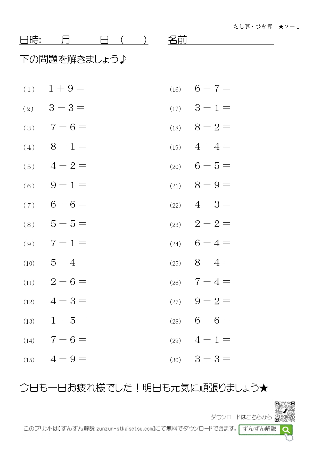 【無料】計算問題30問 たし算ひき算ミックス2 くり上がりあり・くり下がりなし 1桁±1桁 訓練課題 X Facebook はてブ LINE コピー 2026.01.122026.02.13 全て無料でお使いいただけます。 ご利用前に<利用規約>をお読みください。 両面印刷しやすいように、1つの課題に2ページ入っています。 スポンサーリンク 目次 計算30 くり上がりあり・くり下がりなし 1桁±1桁 計算30 くり上がりあり・くり下がりなし 1桁±1桁 計算30問 2(くり上がりあり くり下がりなし) 課題1 計算30問 2(くり上がりあり くり下がりなし) 課題2 計算30問 2(くり上がりあり くり下がりなし) 課題3 計算30問 2(くり上がりあり くり下がりなし) 課題4 計算30問 2(くり上がりあり くり下がりなし) 課題5 計算30問 2(くり上がりあり くり下がりなし) 課題6 計算30問 2(くり上がりあり くり下がりなし) 課題7 計算30問 2(くり上がりあり くり下がりなし) 課題8 計算30問 2(くり上がりあり くり下がりなし) 課題9 計算30問 2(くり上がりあり くり下がりなし) 課題10