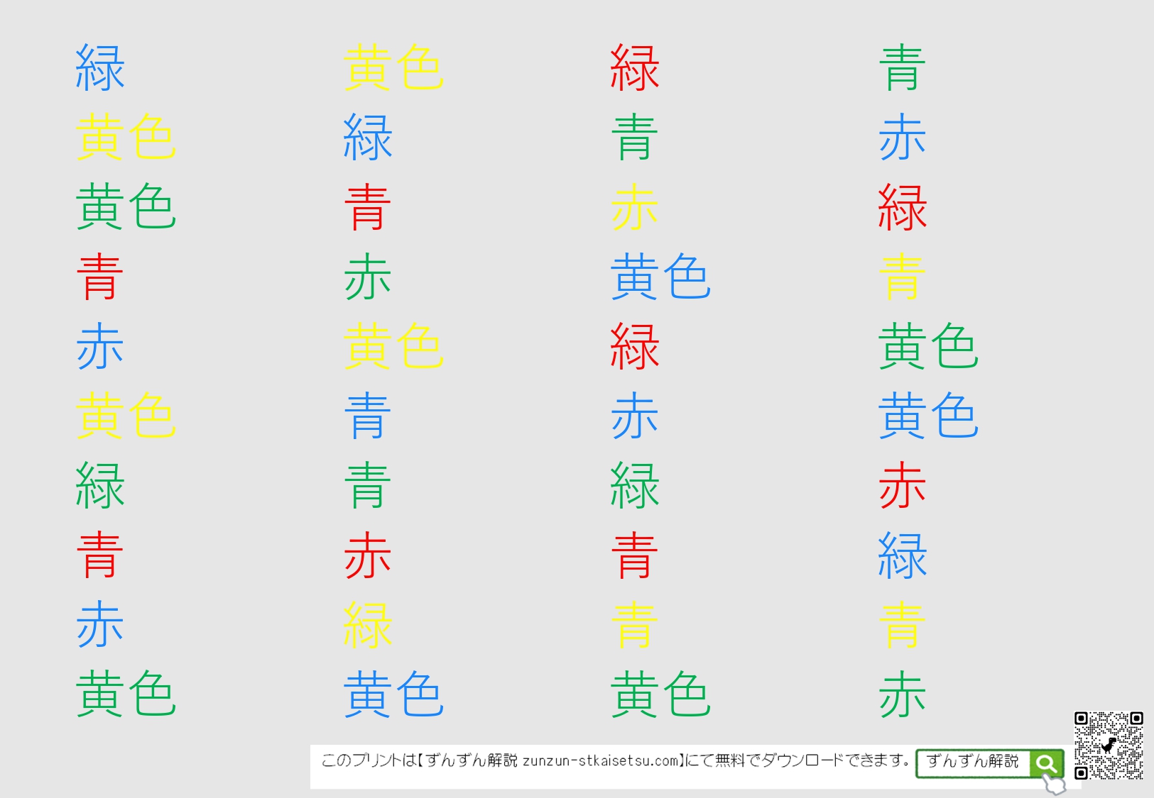 また、このページのストループ課題で使用されている色は「あか」「あお」「きいろ」「みどり」の4色です。